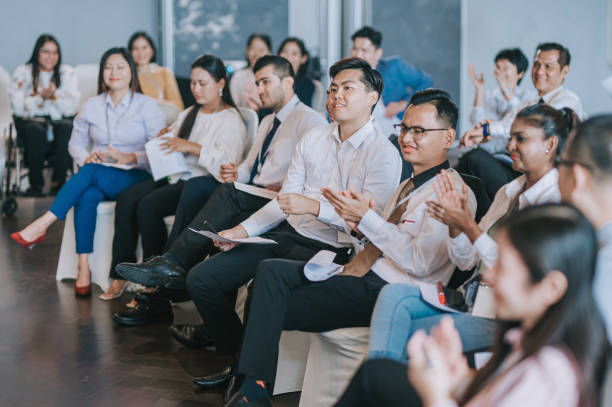 Asian seminar participants applauding listening to presenter on stage