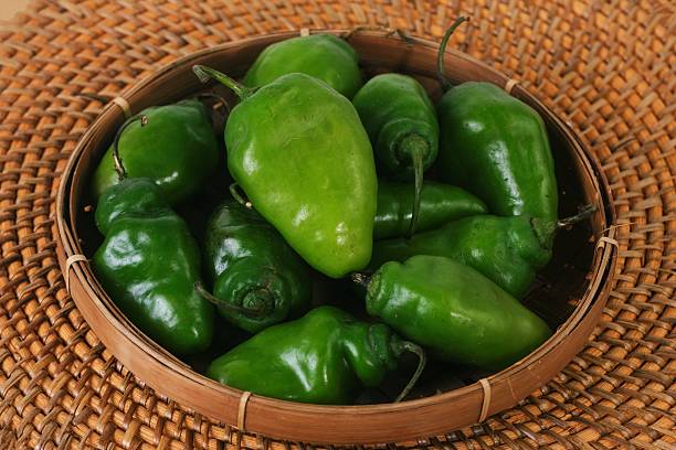 Close up of fresh green chili gendot in bamboo basket on woven mat, authentic Indonesian spice ingredient.