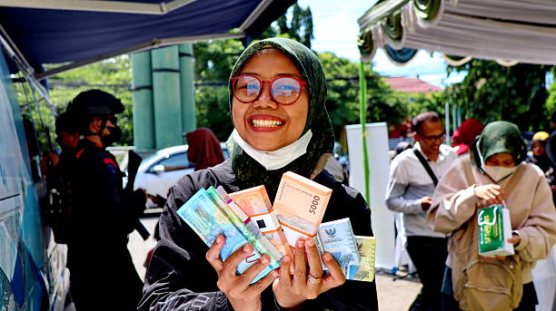 People exchanging new rupiah denominations at the mobile cash van organized by Bank Indonesia, queues of people exchanging money, Pekalongan Indonesia March 11, 2025