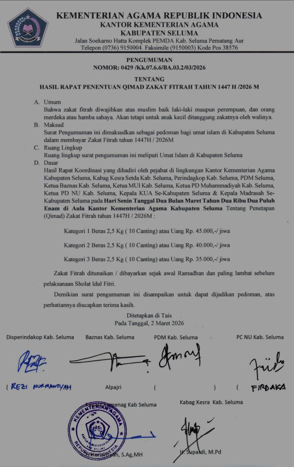 Kantor Kementerian Agama (Kemenag) Kabupaten Seluma resmi menetapkan besaran zakat fitrah untuk tahun 1447 Hijriah atau 2026 Masehi.
