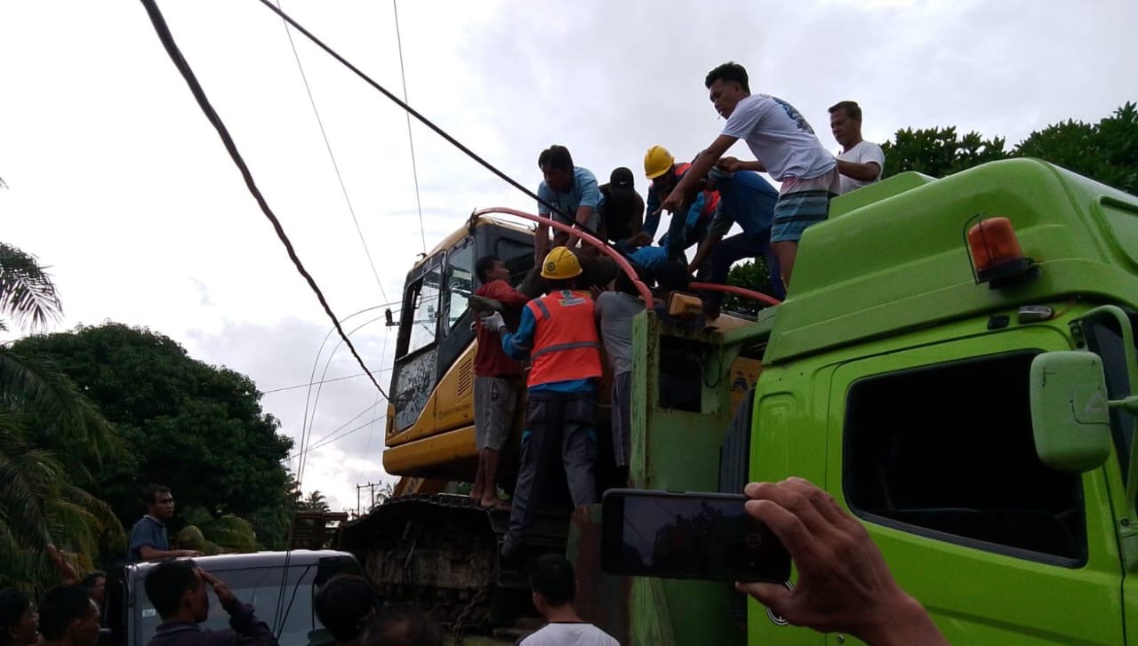Sebuah truk pengangkut alat berat dengan nomor polisi BD 8480 CZ tanpa sengaja menyenggol kabel listrik telanjang.