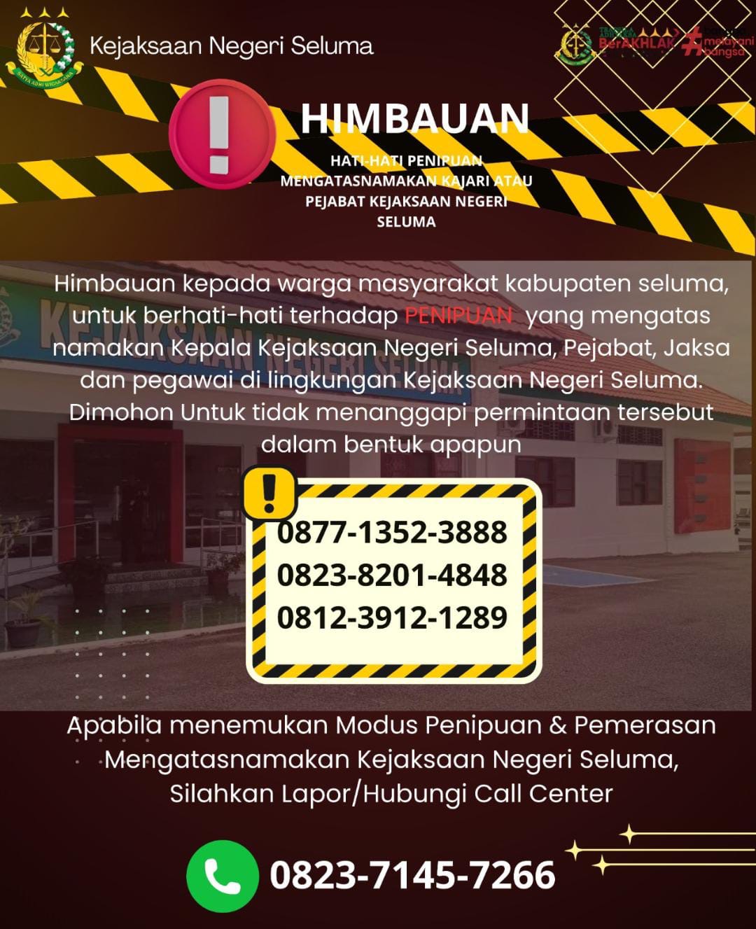 Tags: aksi kriminalitas siberkasi pidsus kejari selumakepala kejaksaan negeri selumakorbannomor asingpesan singkatwaspada penipuan